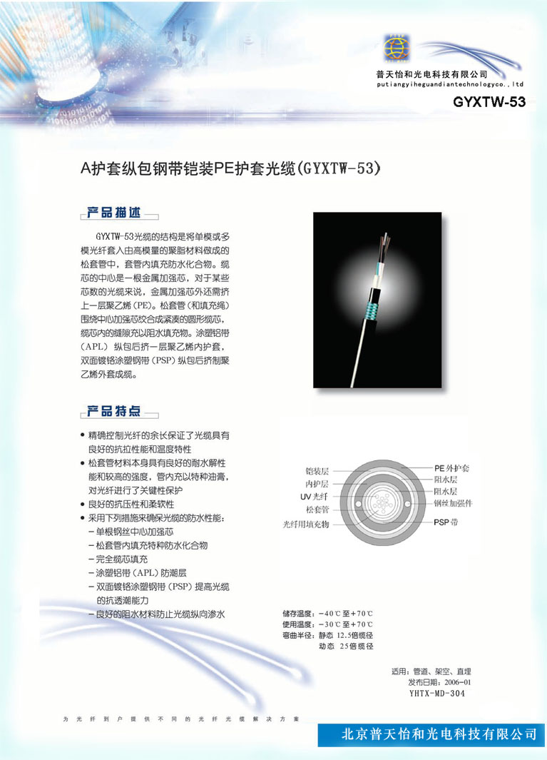 >> A護(hù)套縱包鋼帶鎧裝PE護(hù)套光纜(GYXTW-53)